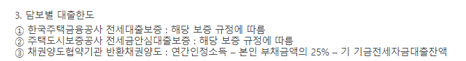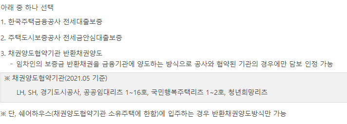 1.임차 전용면적은 85m2이하 주택(주거용 오피스텔 포함) 및 채권양도협약기관 소유의 기숙사(호수가 구분되어 있고 전입신고가 가능한 경우)