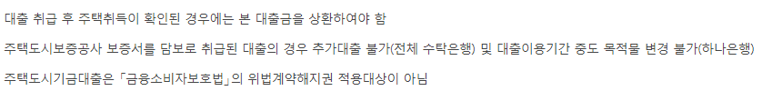 대출접수일 현재 공공임대주택에 입주하고 있는 경우 불가하며 대출신청 물건지가 해당 목적물인 경우이거나 대출신청인 및 배우자가 퇴거하는 경우 대출가능합니다.