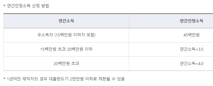 소득은 대출신청인 밎 배우자의 합산 총 소득이 5천만원 이하여야 가능하며, 예외로 신혼가구 ,혁신도시 이전 공공기관 종사자, 타 지역으로 이주하는 재개발 구역내 세입자,다자녀가구 ,2자녀가구인 경우는 6천만원 이하까지 가능합니다.