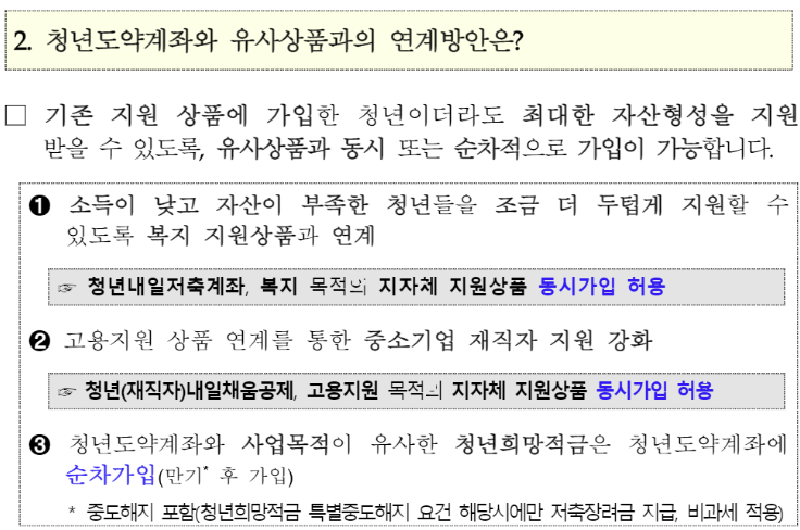 청년도약계좌와 청년희망적금은 사업 목적이 유사하여 정부에서는 청년희망적금 만기 또는 해지 후 청년도약계좌 순차가입을 허락하기로 했습니다.