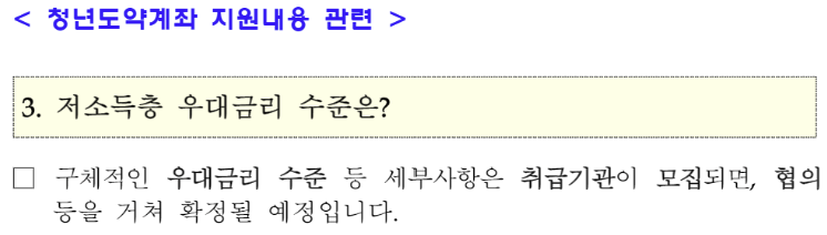 - 저소득층 청년(예:2,400만원 이하)을 보다 두텁게 지원하기 위해 일정수준의 우대금리(예:50bp)를 부여할 수 있도록 취급기관과 협의해 나가겠습니다.
