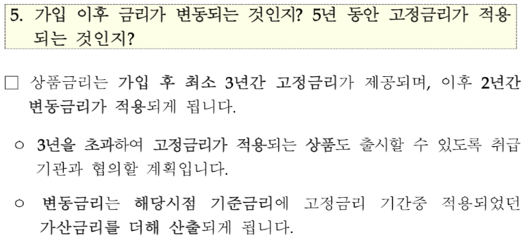 - 아울러, 3년을 초과하여 고정금리가 적용되는 구조의 상품도 출시할 수 있도록 취급기관과 협의할 계획입니다.