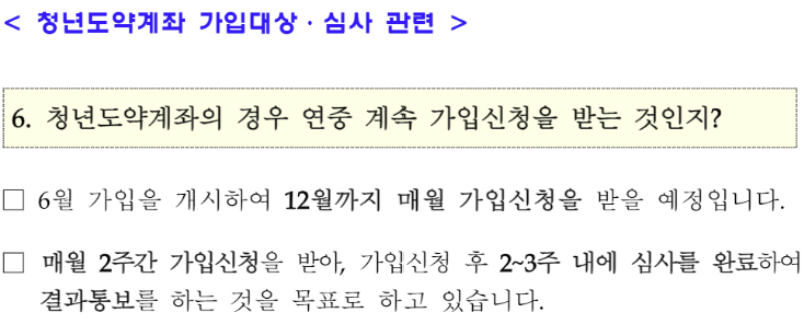 □ 청년도약계좌는 ‘23.6월*부터 가입신청을 받아 비대면 심사를 실시하며, 가입일로부터 1년을 주기로 유지심사를 시행할 예정입니다.