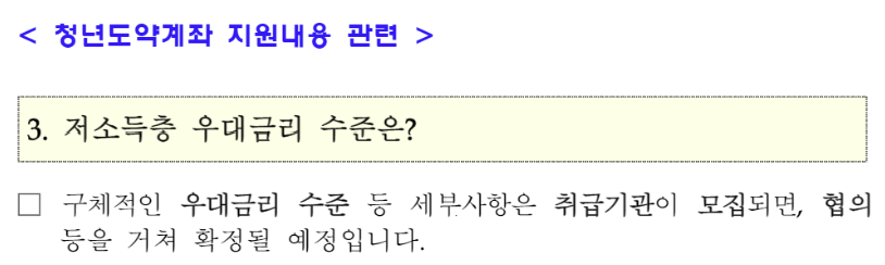 - 저소득층 청년(예:2,400만원 이하)을 보다 두텁게 지원하기 위해 일정수준의 우대금리(예:50bp)를 부여할 수 있도록 취급기관과 협의해 나가겠습니다.