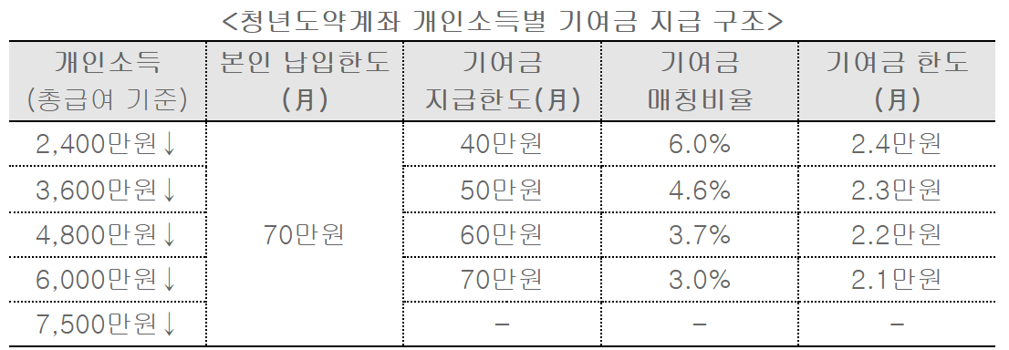 - 매칭비율은 개인소득이 낮을수록 많은 지원이 이루어질 수 있도록 소득구간별로 차등을 두었습니다.