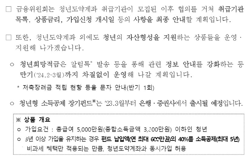 ㅇ 이에 따라, 청년도약계좌 취급기관을 모집하기 위해 현재까지 관계기관과 협의가 완료된 사항을 안내하고, 상품출시를 위한 후속 절차들을 진행해 나갈 예정입니다.