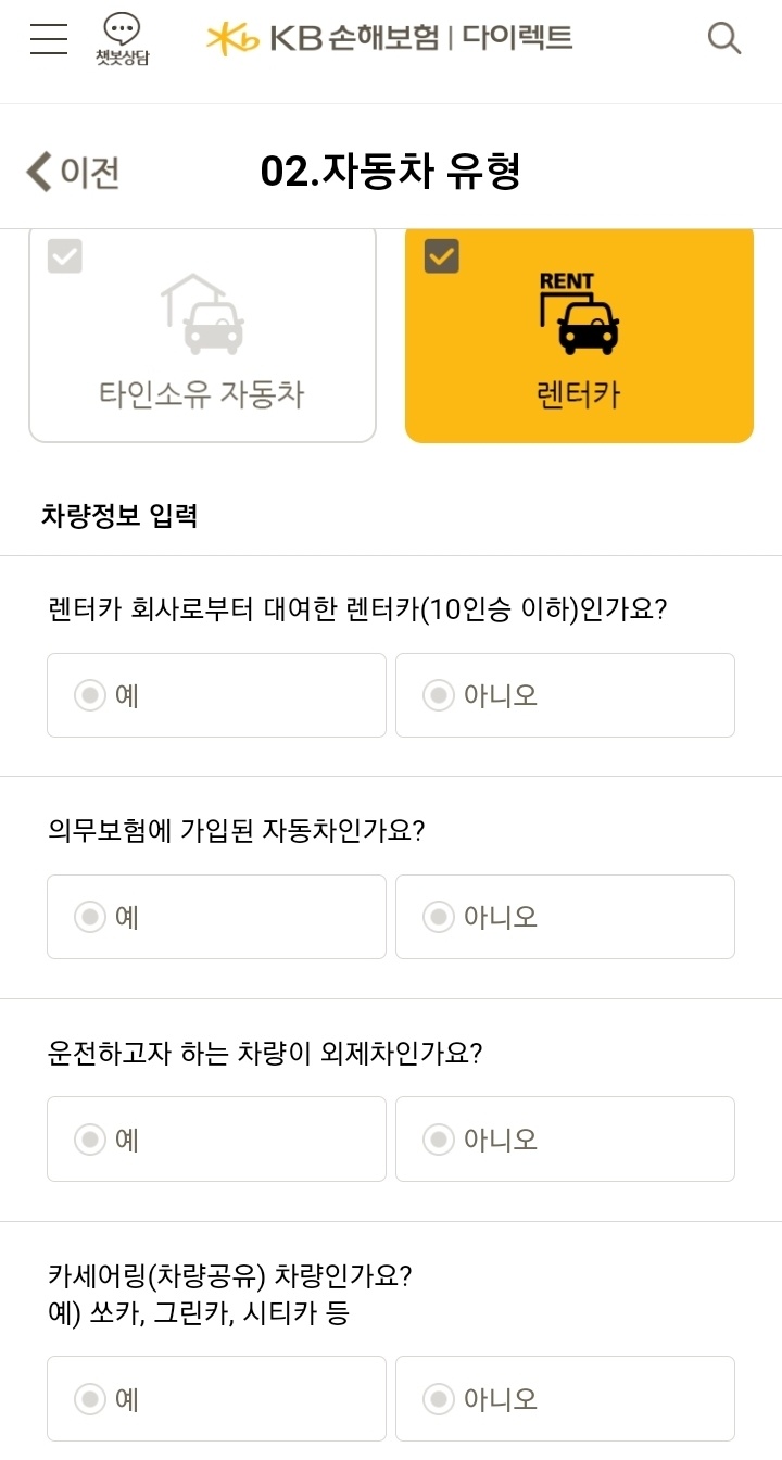 자동차가 타인 소유 자동차인지 렌트카인지 클릭합니다.