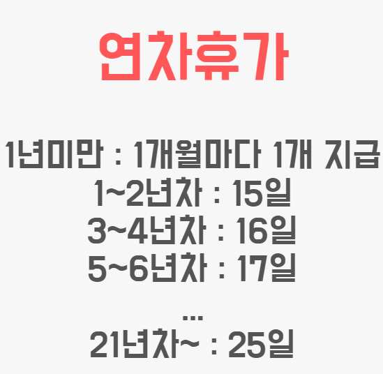 1년 이상 일 때는 연차가 15일, 3년 이상일 경우 2년마다 가산하여 +1일이 생기기 때문에 3년 차에는 16일, 5년 차에는 17일,