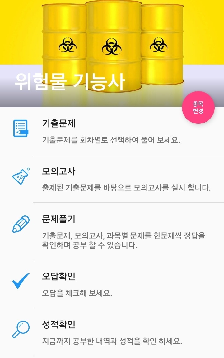 어플을 이용하여 연도별 기출문제와 모의고사 각종 문제를 풀 수 있으며 오답 확인도 가능합니다. 필기시험 합격률이 낮은 만큼 문제를 많이 풀어 철저히 대비해서 1년에 4번 있는 시험이니 한 번에 합격하시는 게 좋습니다.