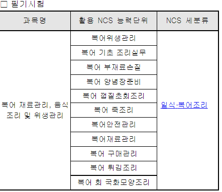 필기시험과목은 복어재료관리와 음식 조리 및 위생관리입니다.