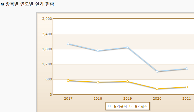 연도별 실기시험 합격률이며, 2021년 기준 필기시험 응시자 수는 1,021명으로 그 중 합격자는 293명입니다.