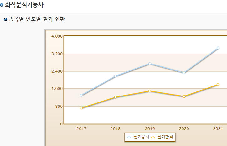 연도별 필기시험 합격률이며 2021년 기준 필기시험 응시자 수는 3,455명으로 그 중 합격자는 1,788명입니다.