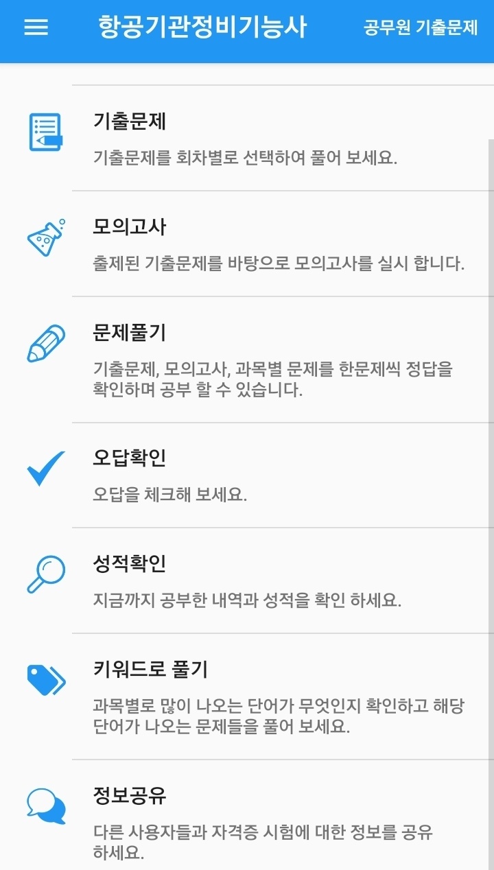 어플로 연도별 기출문제와 모의고사 각종 유형의 문제를 풀 수 있으며, 오답 확인도 가능합니다. 또한 시험 준비생분들과 자격증 시험에 대한 정보공유도 가능하여 아주 유용한 어플입니다.