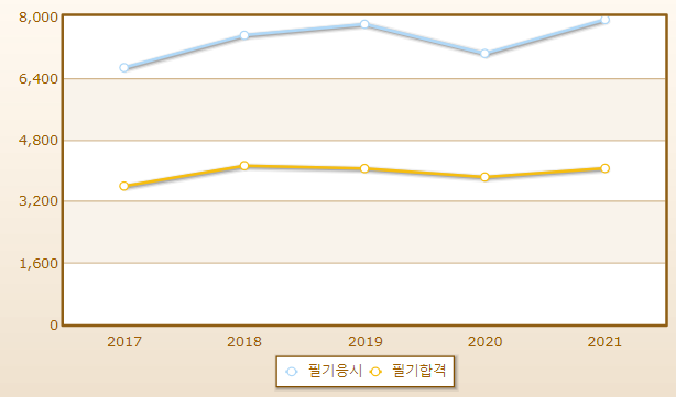 연도별 필기시험 합격률이며 2021년 기준 응시자 수는 7,913명으로 그 중 합격자는 4,047명입니다.