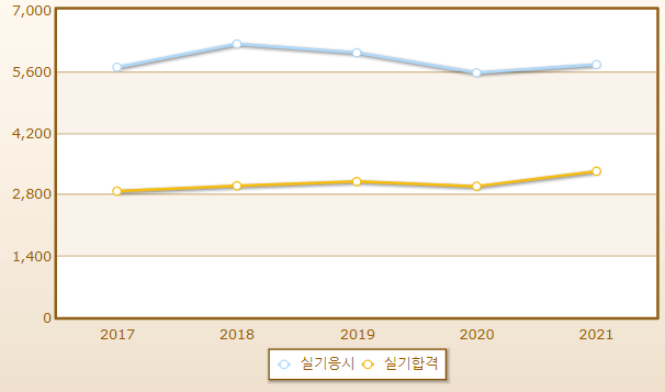 연도별 실기시험 합격률이며 2021년 기준 응시자 수는 5,749명으로 그 중 합격자는 3,320명입니다.