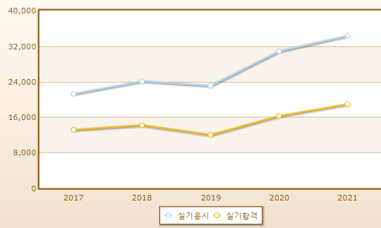 연도별 실기시험 합격률이며 2021년 기준 실기시험 응시자 수는 34,308명으로 그 중 합격자는 18,097명입니다.