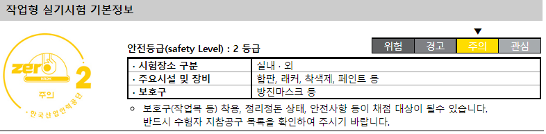 건축도장기능사 시험은 안전등급 2레벨 등급으로 시험 진행 시 보호구 착용 및 수험생 지참공구를 참고하셔서 꼭 챙기셔야 감점을 받지 않습니다.