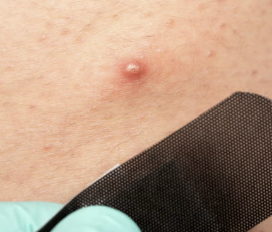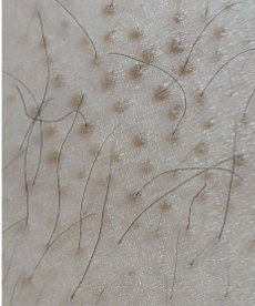 1. 모낭 주위에 작은 융기 또는 여드름의 클러스터 : 모낭염은 주로 털이 있는 부위에 발생하므로, 팔, 다리, 얼굴, 두피, 사타구니 등에서 볼 수 있습니다. 모낭 주변에 작은 붉은 돌기나 여드름이 생기며, 고름이 가득찬 물집이 터져 열리거나 딱지가 생길 수 있습니다.