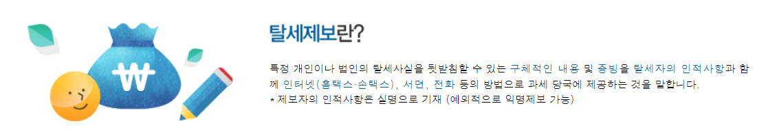 국세청> 국민소통> 국세청 100배 활용하기 가이드맵> 탈세제보 (nts.go.kr)