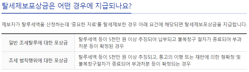 가장 높은 포상금 받을 수 있는 유형은 조세탈루건인데 제보자는 인적사항을 실명으로 기재해야 하며, 특정 법인과 개인의 구체적인 탈세 사실을 기록, 이를 뒷받침할 수 있는 증거자료를 첨부하여 국세청에 제출해야 합니다. 만일 국세청에 제보한 자료로 세무조사 진행 시 그 덕에 추징세액이 5천만 원 이상 납부되면 최대한도 40억 원 내에서 포상금을 지급합니다.
