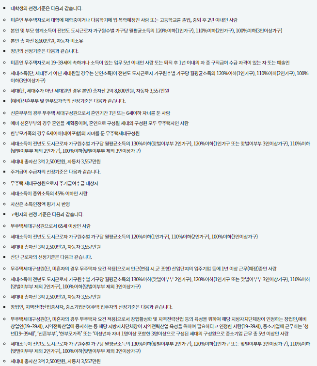 - (예비)신혼부부, 한부모가족 ,산업단지 근로자, 중소기업전용주택 입주 장기 근속자 :시세의 80%