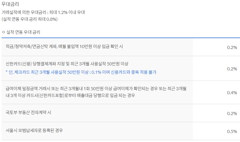 또한 우대금리 조건은 금리구분에 따라 최대 0.9% ~ 1.2%까지 가능하며 우대금리 조건은 아래와 같습니다.