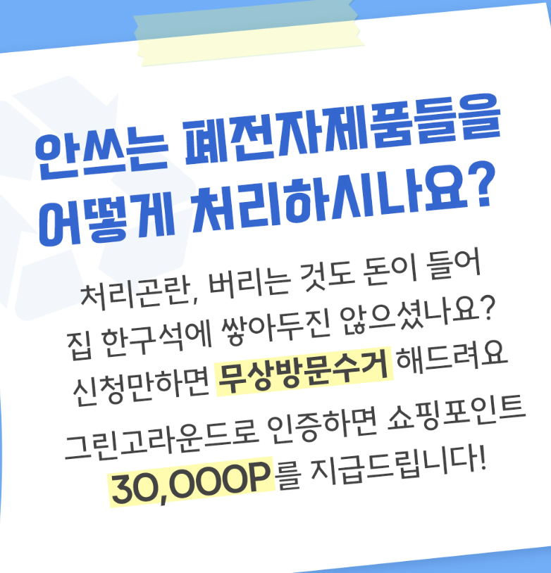 - 폐가전 무상 방문 수거: 한국전자제품자원순환공제조합에서는 폐가전제품 무상 방문 수거 서비스를 제공하고 있습니다. 홈페이지나 콜센터(1599-0903)를 통해 예약하면 원하는 날짜에 수거 기사님이 직접 방문하여 수거해 갑니다. 단, 소형가전제품은 5개 이상 모아서 신청해야 하며, 단독 신청은 불가능합니다. 저는 이 서비스를 이용하여 고장 난 헤어드라이어, 토스터기, 전기포트 등 여러 개의 소형가전을 한 번에 처리할 수 있었습니다. 😊