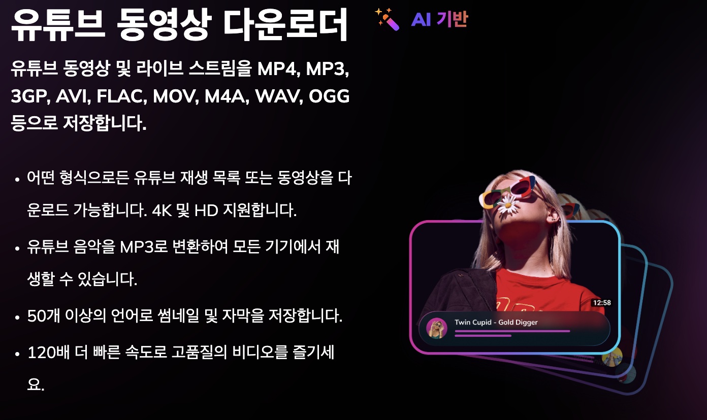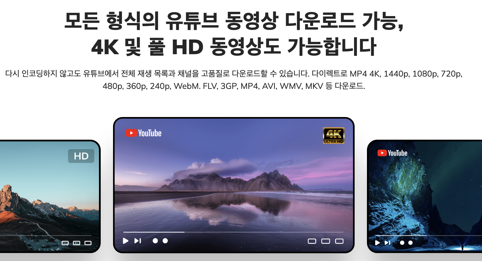 - HD, 4K 해상도까지 지원하며, 플레이리스트 전체를 다운로드할 수 있습니다.
