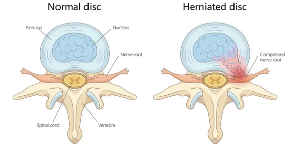 - 추간판(디스크)이 튀어나와 주변 신경을 압박하면서 통증 유발