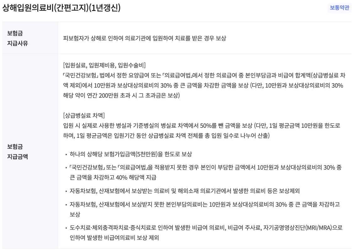 - 질병/상해 입원 의료비: 입원 시 발생하는 의료비 보장