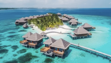 눈부시게 맑은 바다 위에 떠 있는 수상 빌라,