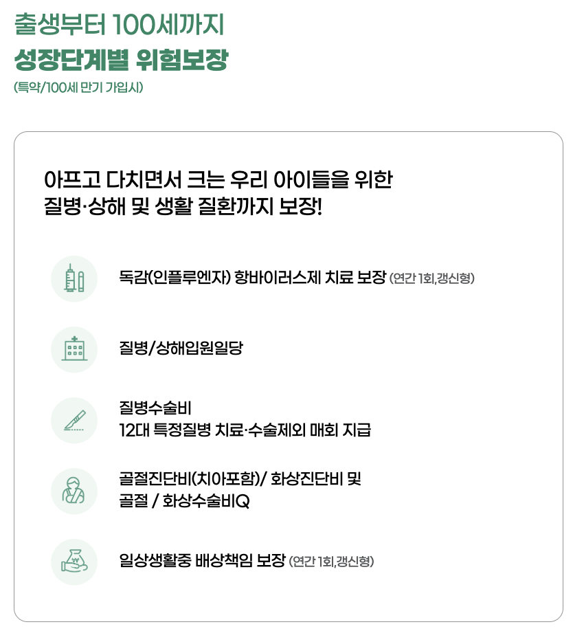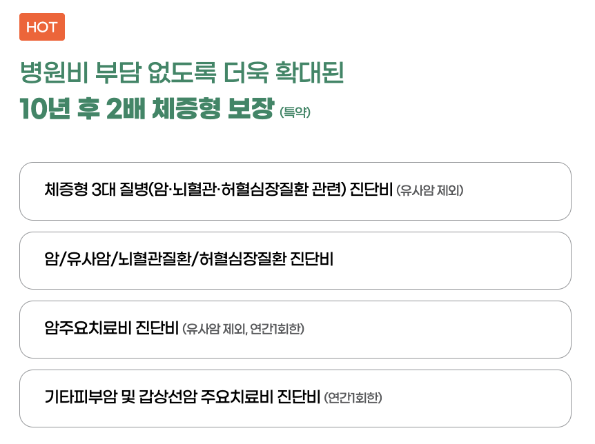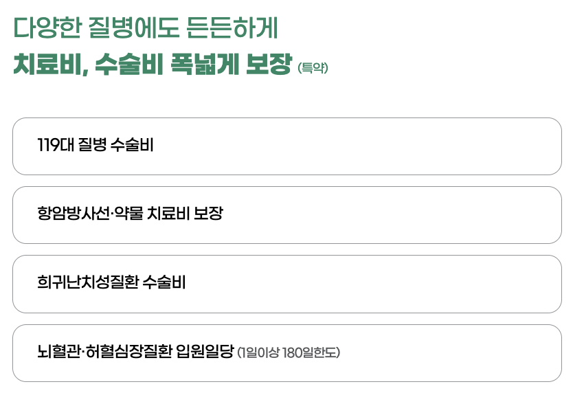 | 주요 보장범위 | 암, 뇌혈관질환, 심혈관질환, 질병·상해 입원 및 수술 |