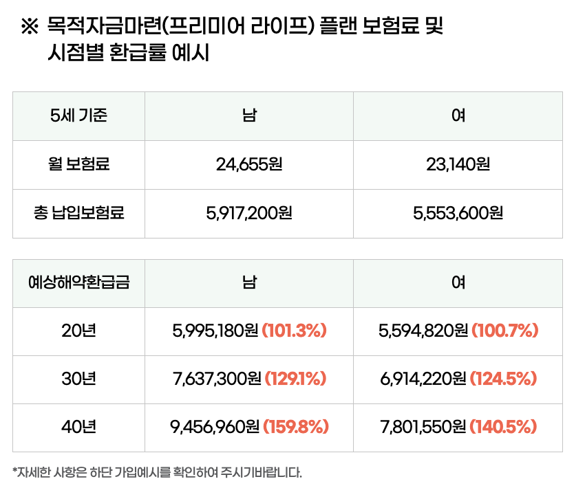 예시 조건 40세 남성 / 20년납 / 100세 만기 기준