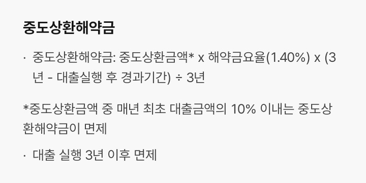 중도상환해약금은 대부분 그렇듯 대출 실행 후 3년 이후 면제입니다.