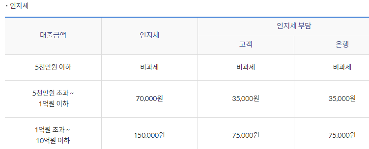 인지세란 대출거래 신규 약정 시 내는 세금으로 대출금액이 5천만원 이하일 경우에는 비과세이며 5천만원 초과부터 위와 같이 대출금액에 따라 인지세가 적용됩니다.