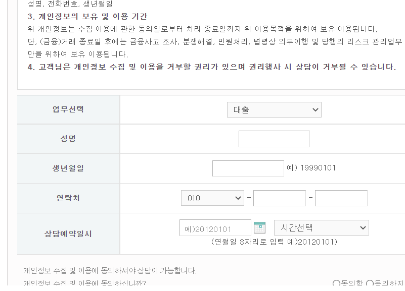 홈페이지 접속 후 상담예약을 클릭하시면 아래와 같이 상담예약이 가능합니다.