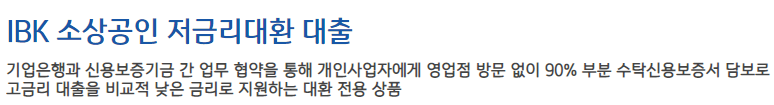 이 상품은 기업은행과 신용보증기금간에 업무 협약을 통해 개인사업자분들에게 영업점 방문 없이 90% 부분 수탁신용보증서를 담보로 고금리 대출을 비교적 낮은 금리로 지원하는 대환대출 상품입니다.