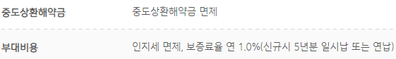 중도상환해약금이 면제인 상품으로 나중에 여유자금이 있다면 언제든 갚아두어 이자 비용을 아낄 수 있습니다.