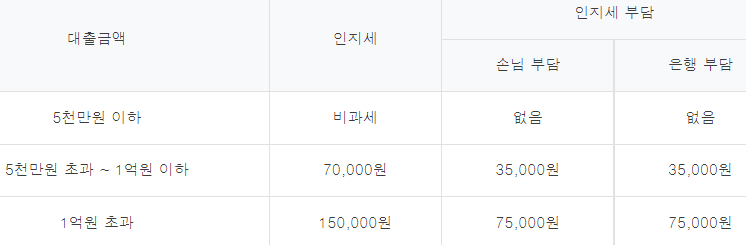 인지세란 대출 거래 신규 약정 시 내는 세금으로 대출 금액에 따라 인지세가 위와 같이 차등 적용되며 위 금액은 고객과 은행이 각각 50%씩 부담하게 됩니다.