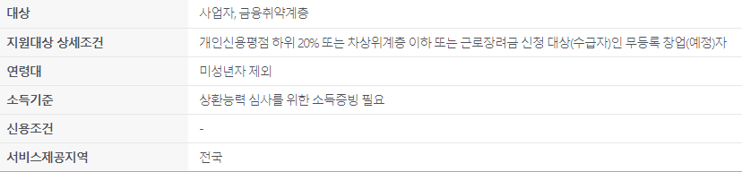 개인신용평점 및 소득이 낮아 제도권 금융 이용이 어려운 서민에게 담보 및 보증 없이 저금리로 창업자금을 대출해주는 정책입니다.